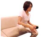 A肩の力を抜いて、軽く膝の上と足首に手を添え、肘で膝を軽く押さえます。このとき可能であれば乗せた足が地面と水平になると理想的です。(写真2、3参照)
