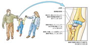腕の2本の骨のうち、親指の方にある橈骨(とうこつ)という骨が肘から抜けないように固定している橈骨輪状靭帯(とうこつりんじょうじんたい)という靭帯から、腕を引っ張られた力により橈骨がスポッと抜けてしまいます。(上橈尺関節の亜脱臼)